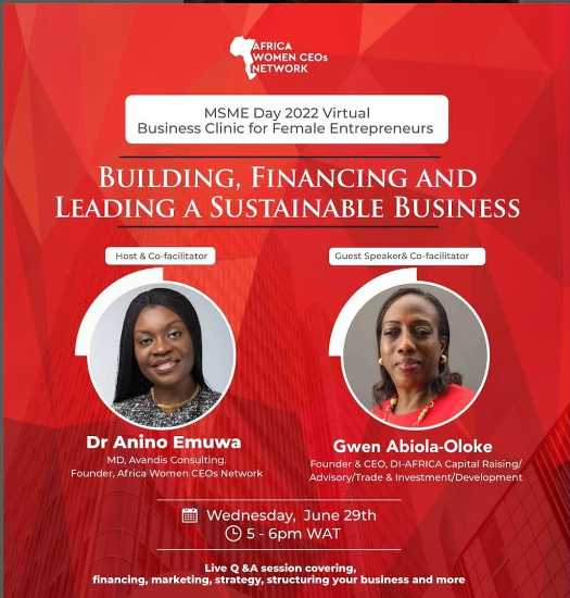 MSME DAY 2022 | Virtual Business Clinic for Female Entrepreneurs Register for our free Africa Women CEOs Network MSME 2022 Day Business Clinic for Female Entrepreneurs , “Building, Financing and Leading A Sustainable Business” on Wednesday, June 29th at 5 pm WAT | 6 pm SAST | 8pm EAT! Yearly, the UN declares 27th of June Micro-, Small and Medium-sized Enterprises Day, to raise public awareness of their contribution to sustainable development and the global economy. The 1-hr virtual business clinic , will diagnose and offer practical solutions to frequent issues faced by entrepreneurs to help you successfully run and grow your business. The live Q&A session will cover topics including:financing, marketing, strategy, and structuring your business. The session will be co-facilitated by: Gwen Abiola-Oloke, @gwenzino Founder/CEO, DI-AFRICA Capital, former regional director GroFin, multi-faceted executive career in banking and finance and in driving SME development in West Africa @dr.emuwa , MD, Avandis Consulting, Founder, @africawomenceos Network-, an international management consultant and expert executive strategist providing advisory services to business leaders and entrepreneurs. Limited spaces so do book your places asap.